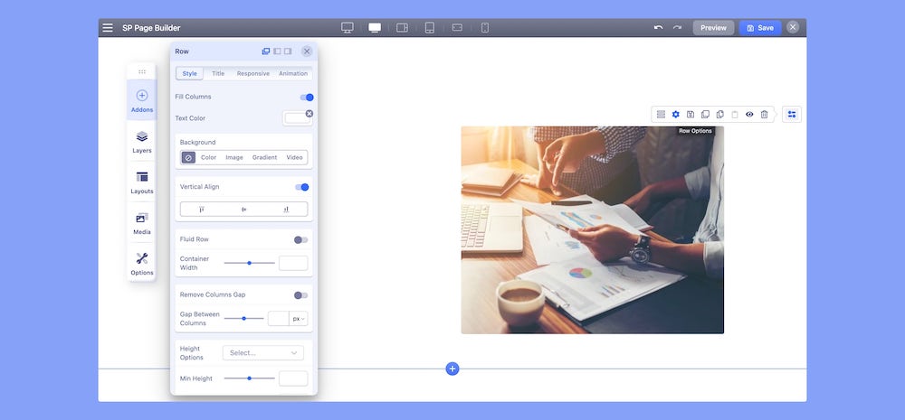 The Row Options consist of the Style, Title, Responsive, and Animation tab.