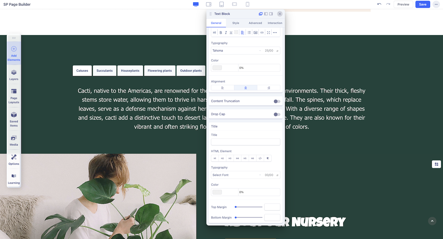 Start by opening the Addons Panel. Click on the Addons button on the Sidebar or the plus icon inside a row to do this. Finally, scroll down to the Content section and drag & drop Tabs to your canvas.