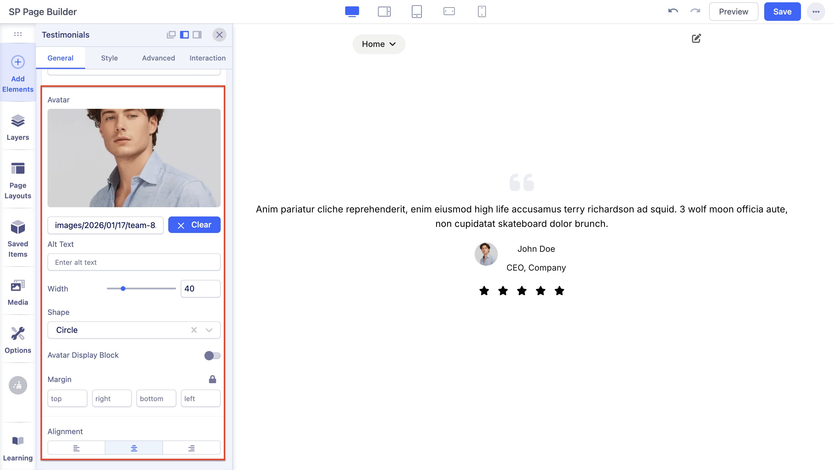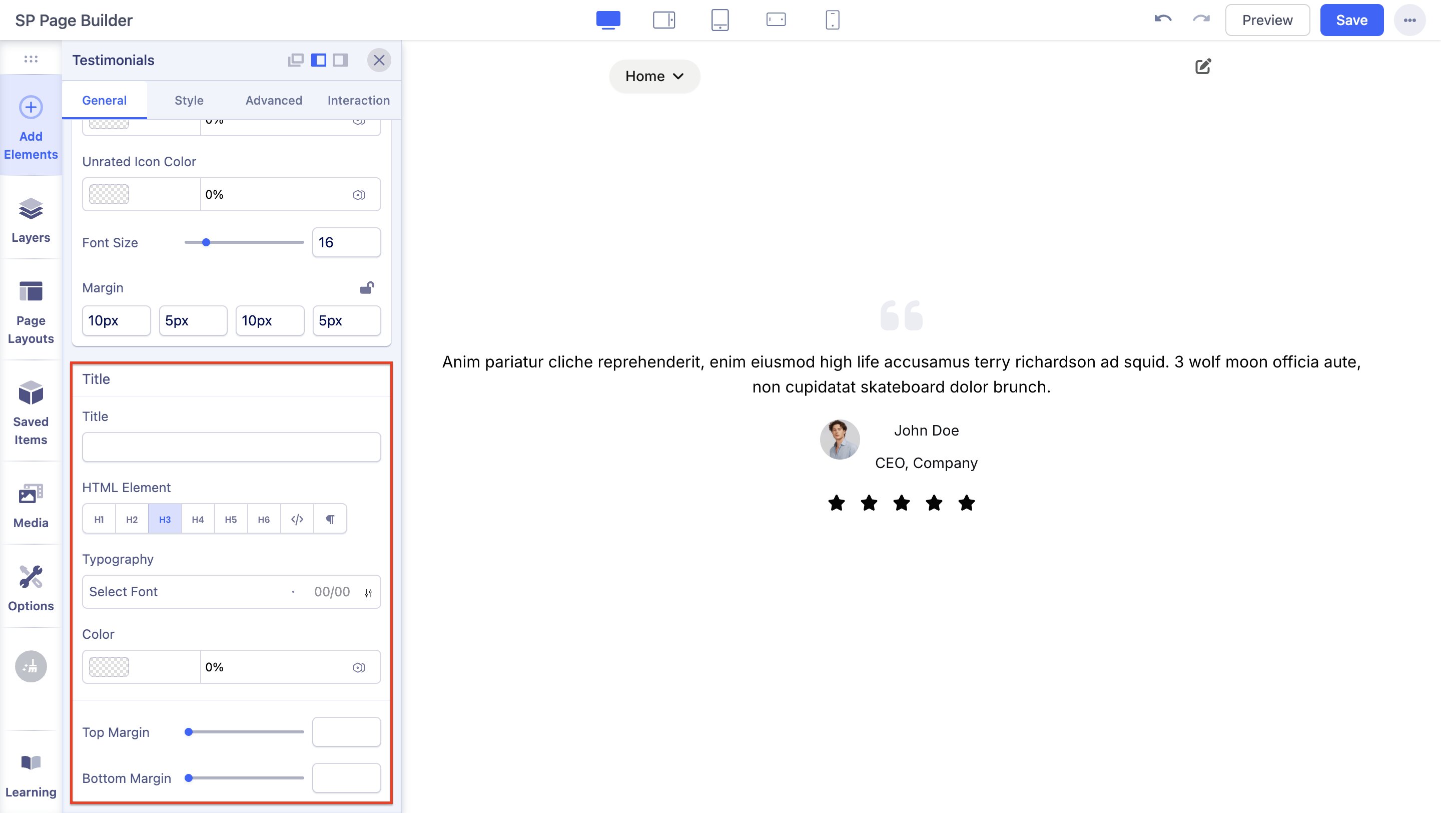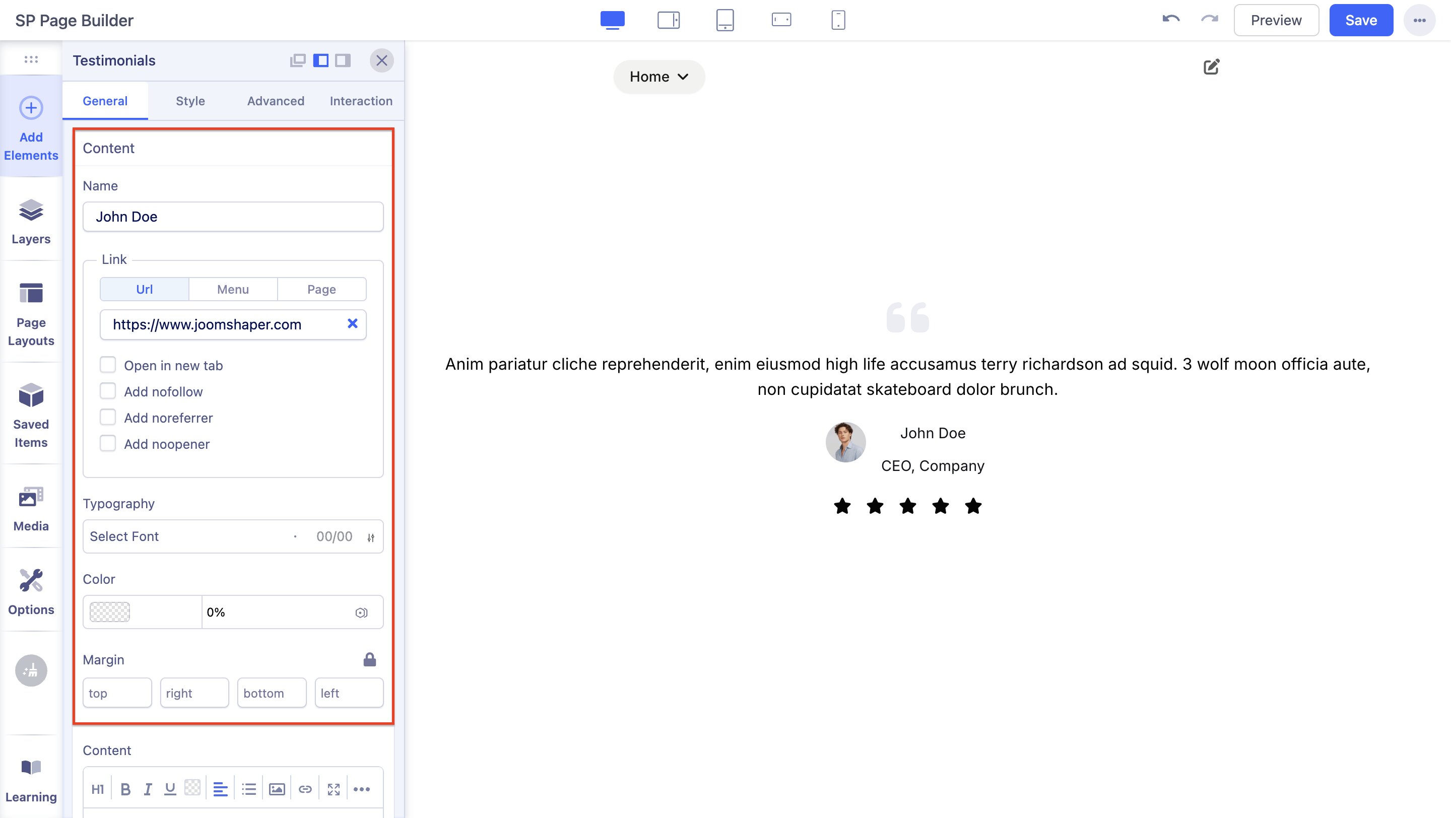Content: You can enter your Review Text within the large text field or simply click on the existing content and edit it directly. This text field comes with several options like Headings, Inline, etc. From here, you’ll be able to select the HTML elements you want your content to consist of. Furthermore, you can customize your Review Text's font size, alignment, make a list, upload an image, etc.