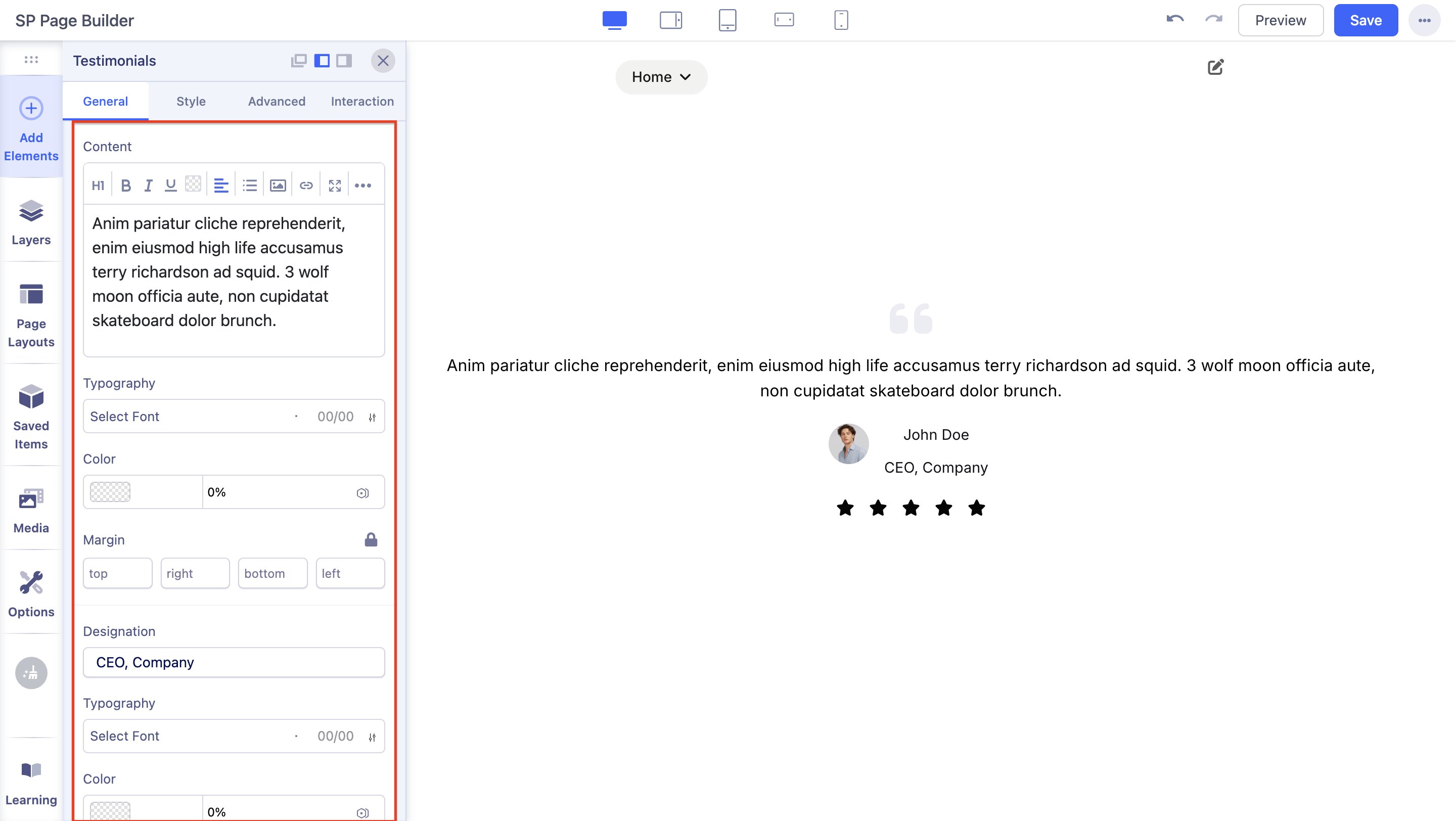 Click on the ‘A’ Letter icon on the inline editor to open the Typography window. Here, you can adjust the Font, Font Size, Line Height, etc for the text in your Testimonials. For detailed information on Typography check out this documentation.