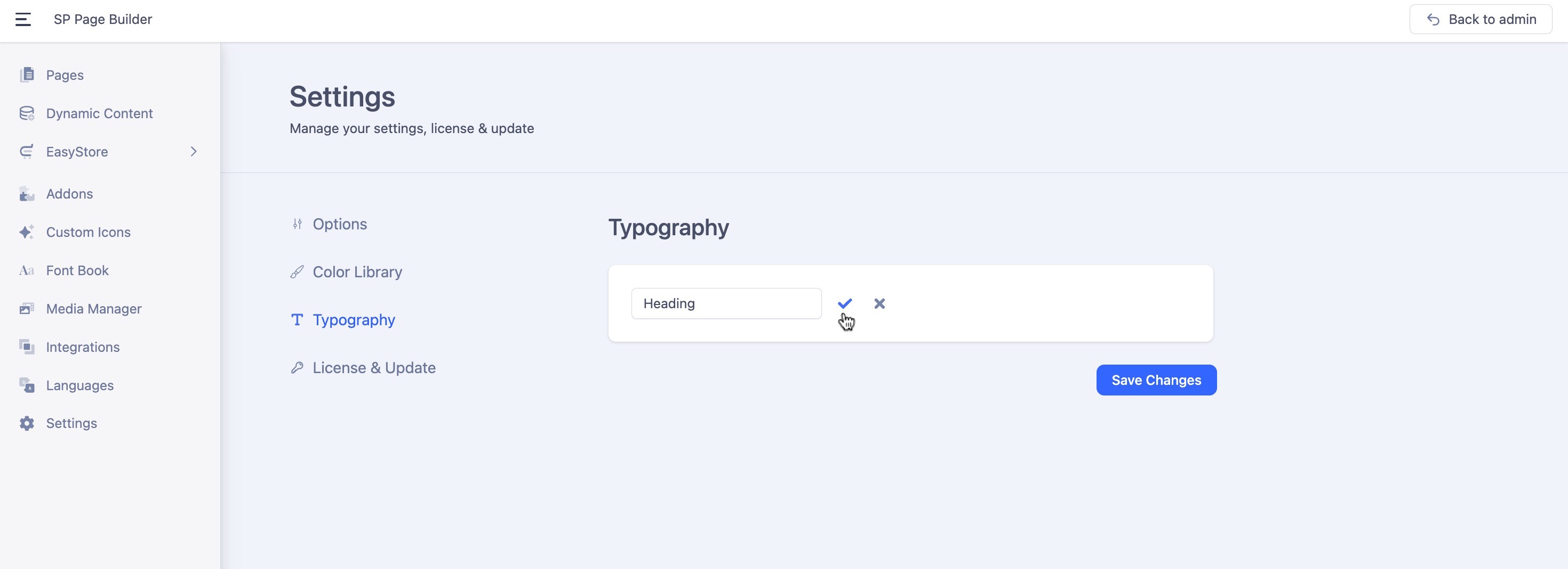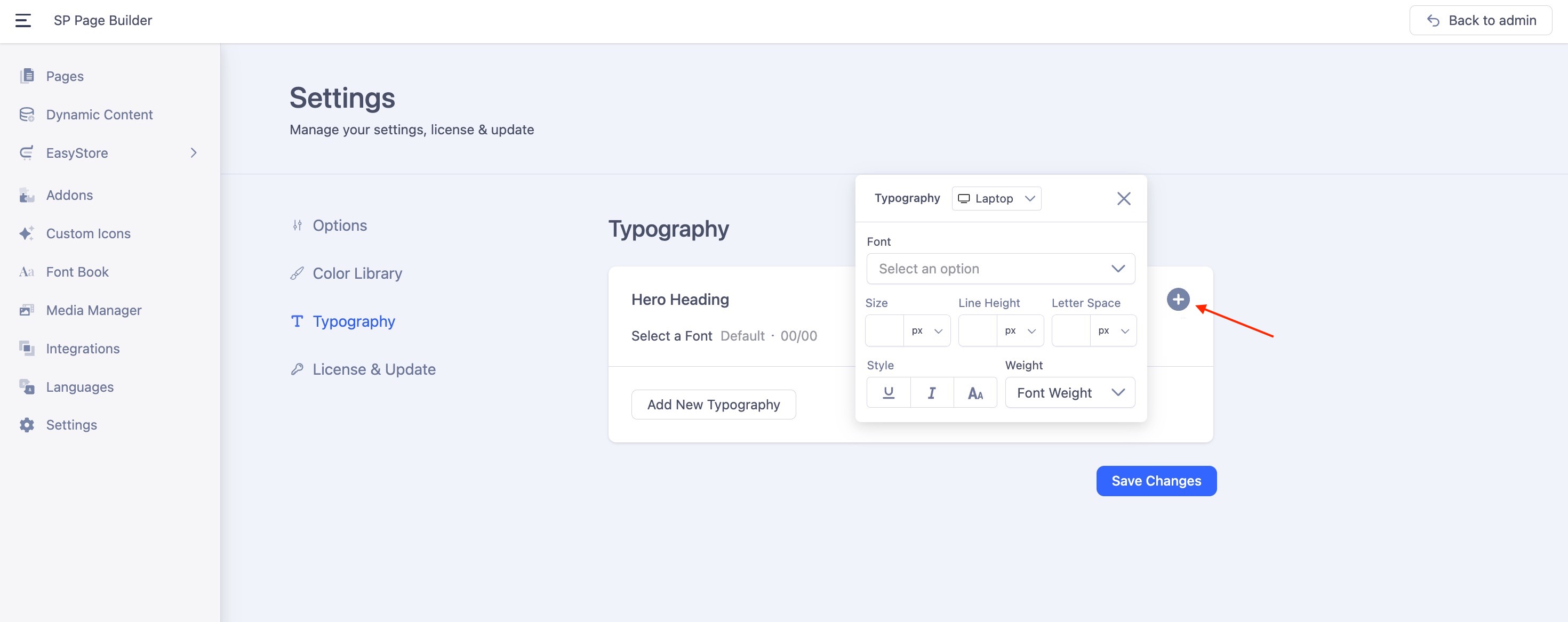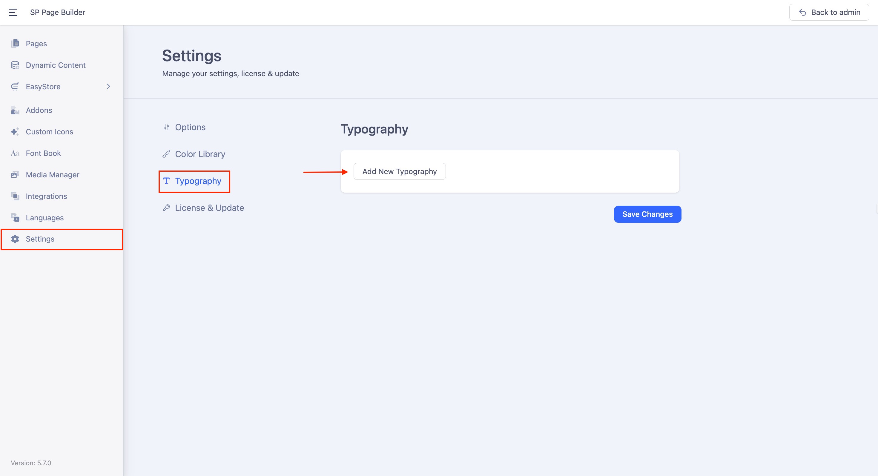The Typography can be accessed from SP Page Builderâs Settings. From the side top bar, go to Settings > Typography.
