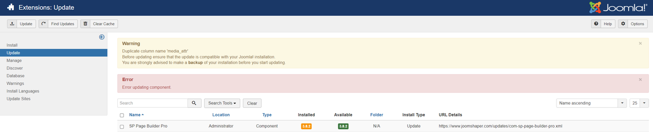 I want to update SP Page Builder from 3.4.x to the latest one (3.8.2). The udpate failed cause of several db errors, but joomla updated the installed version number. The attached image is from the third update try.