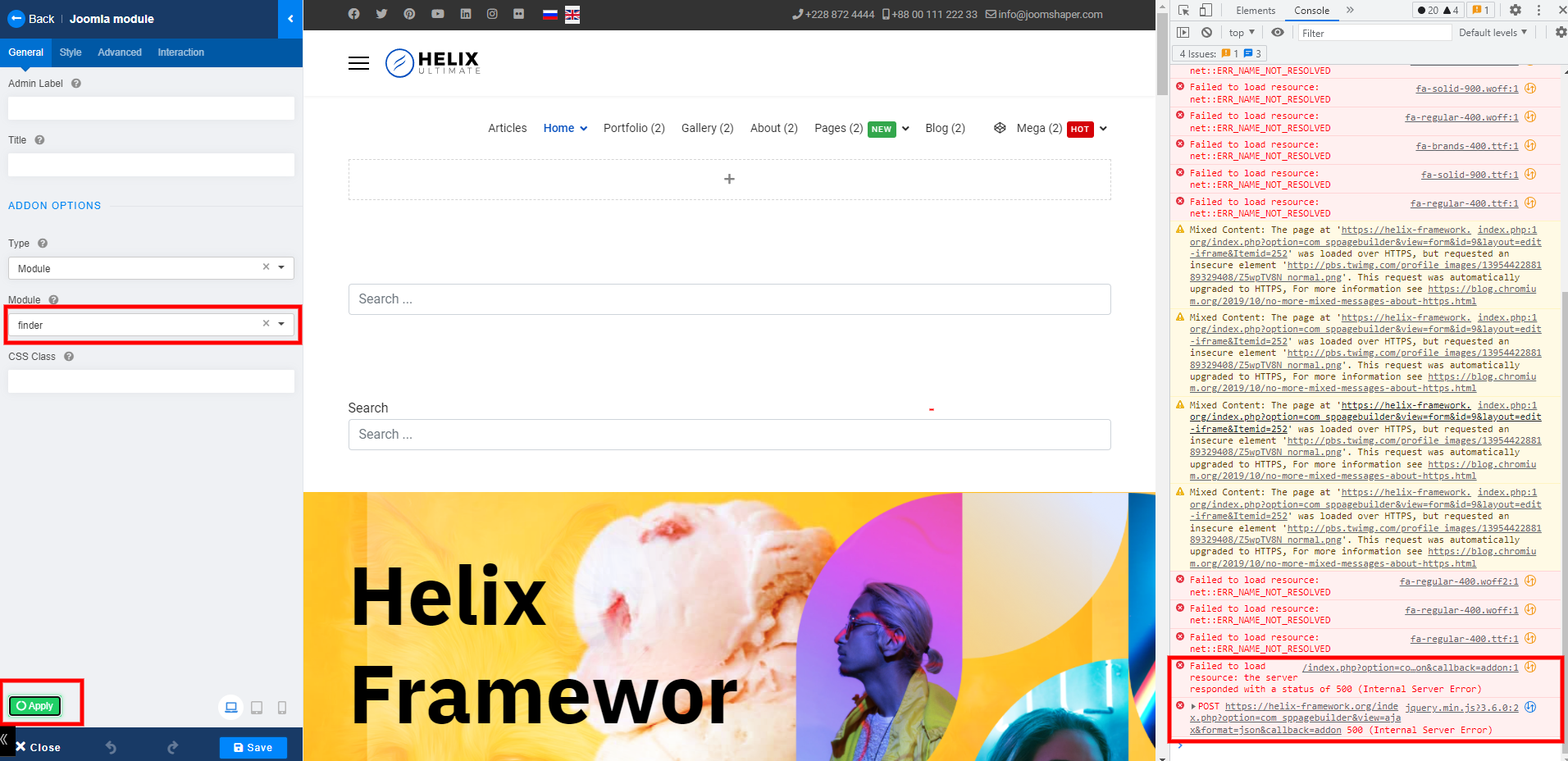 When you try to load the mod_finder module in SP Page Builder using the Joomla Module addon, it does not load, after pressing the Apply button it generates a 500 error in the console.