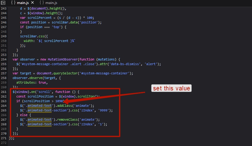 if (scrollPosition > 1090) { //if window scroll position is more than 1090 px from top then the animation begins