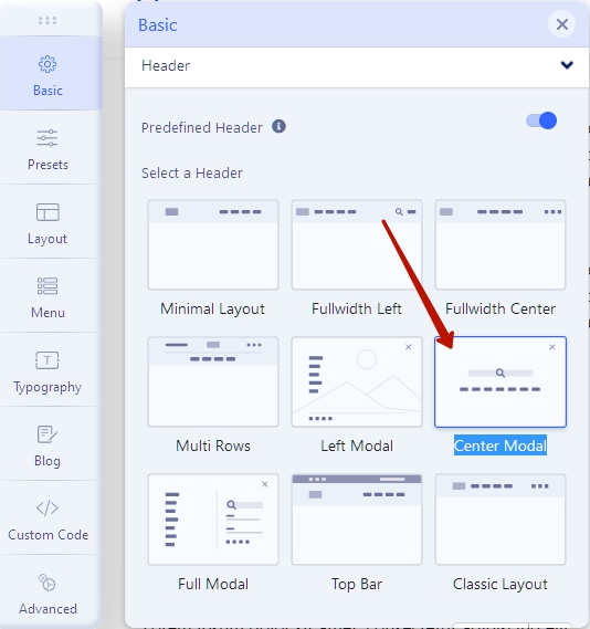In the Helix settings, select Center Modal Header