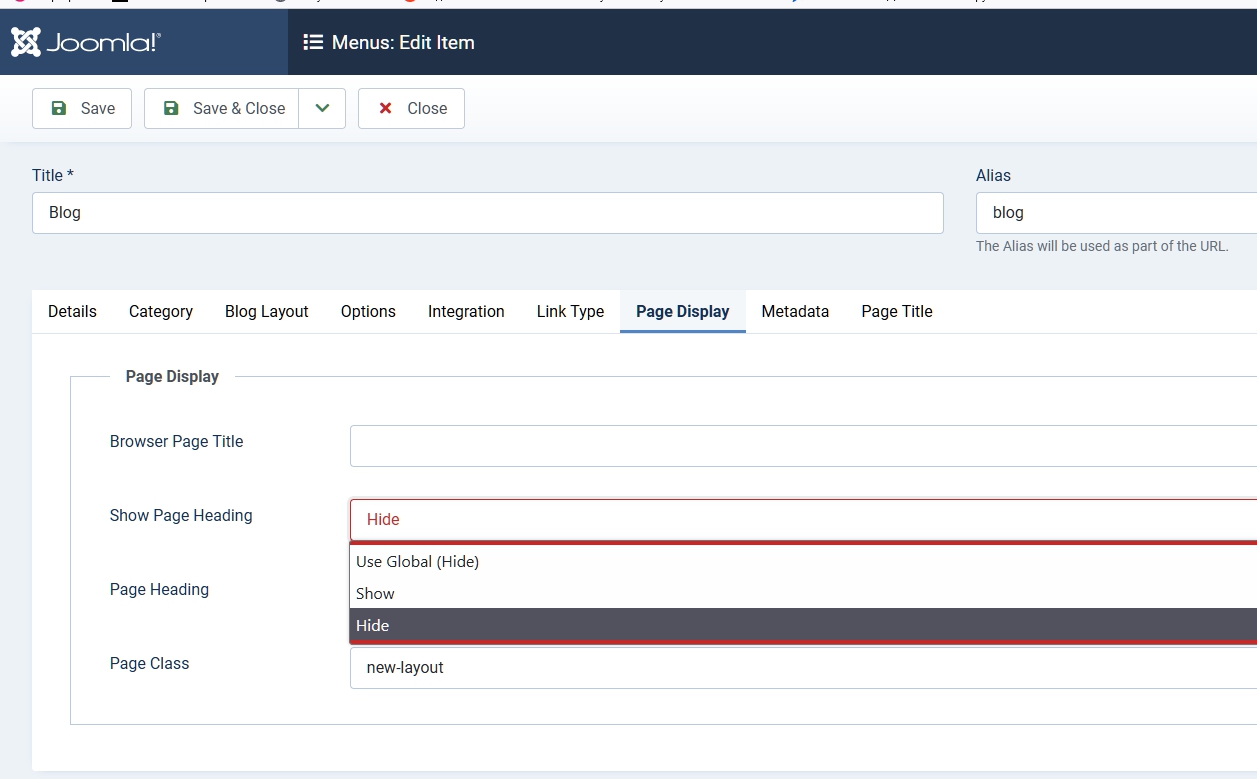 Then you can turn the page heading off from the 'page display' tab in the menu item edit window as follows: