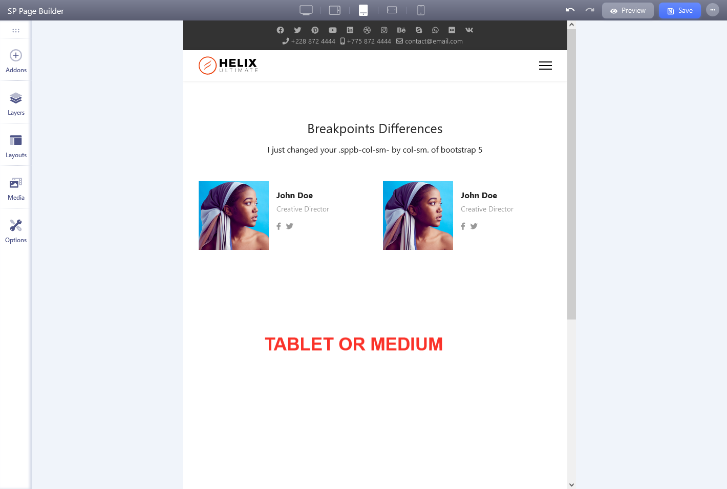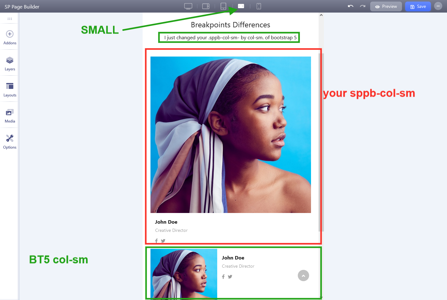 Note: Following Toufiq's advice, do a new Joomla installation, install SPPB5, install Helix, create new page, drag Person addon, choose the layout that has the image on the right. The result is that it loads the sppb-col-sm-5 and sppb-col-sm-7 classes and as I said many times it has the breakpoint from 768px or more, when to coincide with the breakpoints of the editor and bootstrap 5 it must be up to 767.98px. THAT'S THE PROBLEM