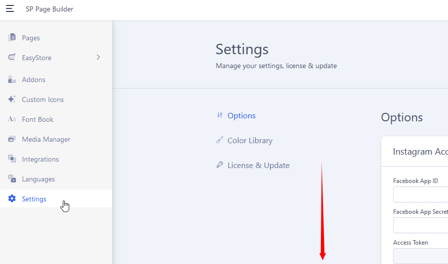 go first to Pages list in admin area, then on left menu you will find Settings, then Scroll Down. View from SPPB 5.1.3.