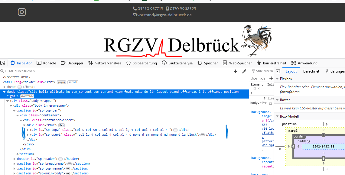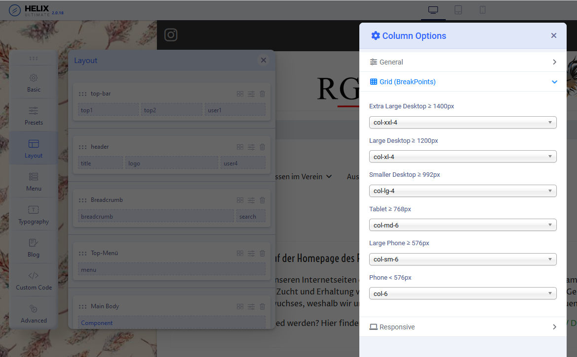 About your main question. If you created 3 columns in row (section) now you have to set their width in each view: Tablet, Mobile. Here is just example for header, but look and read "green box"