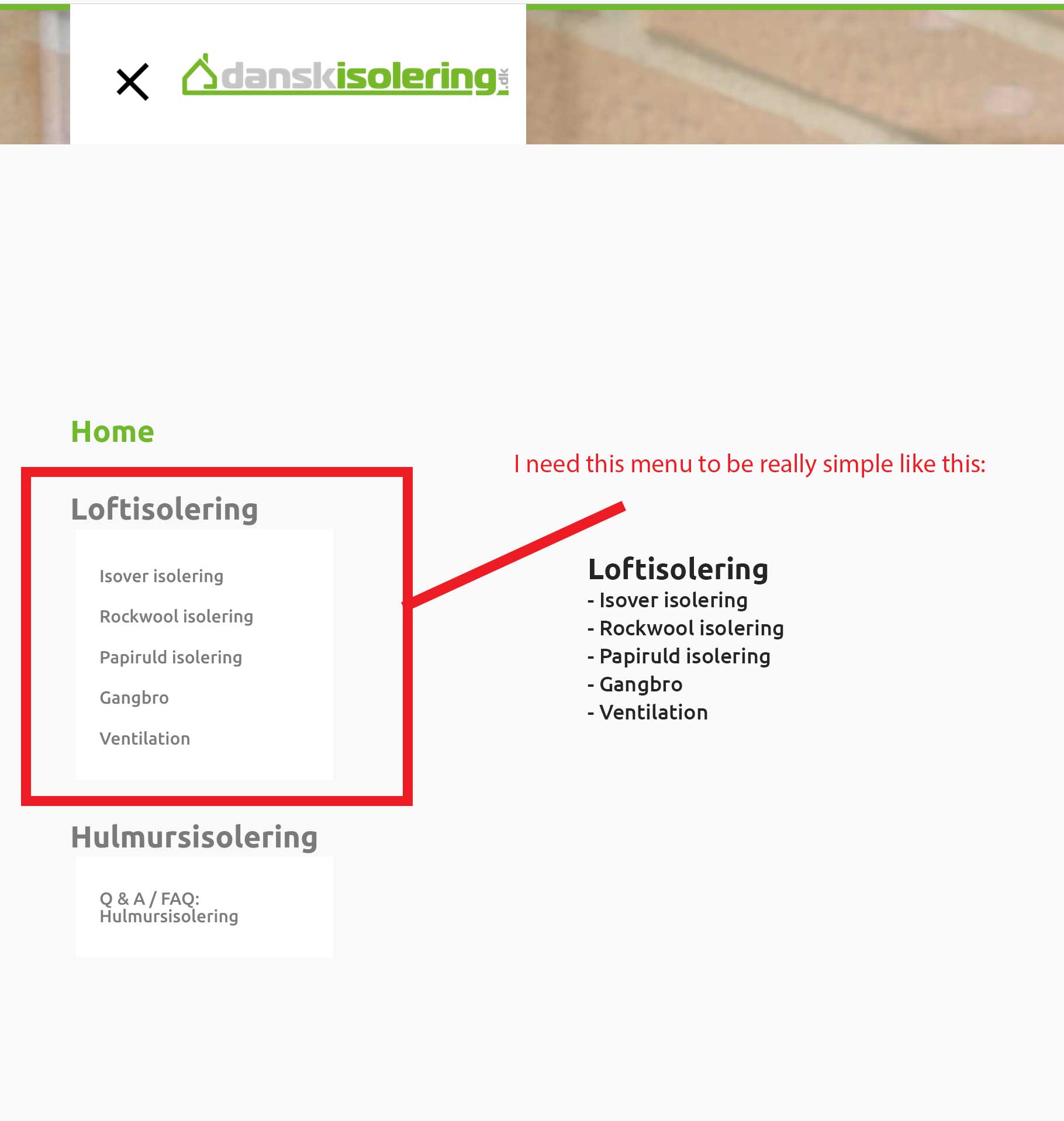 OK here's a screendump off the menu and of what I need to achieve. So instead of a submenu that is styled with animation and boxed bg. I just need it to be really simple and have all menu items open at all time.