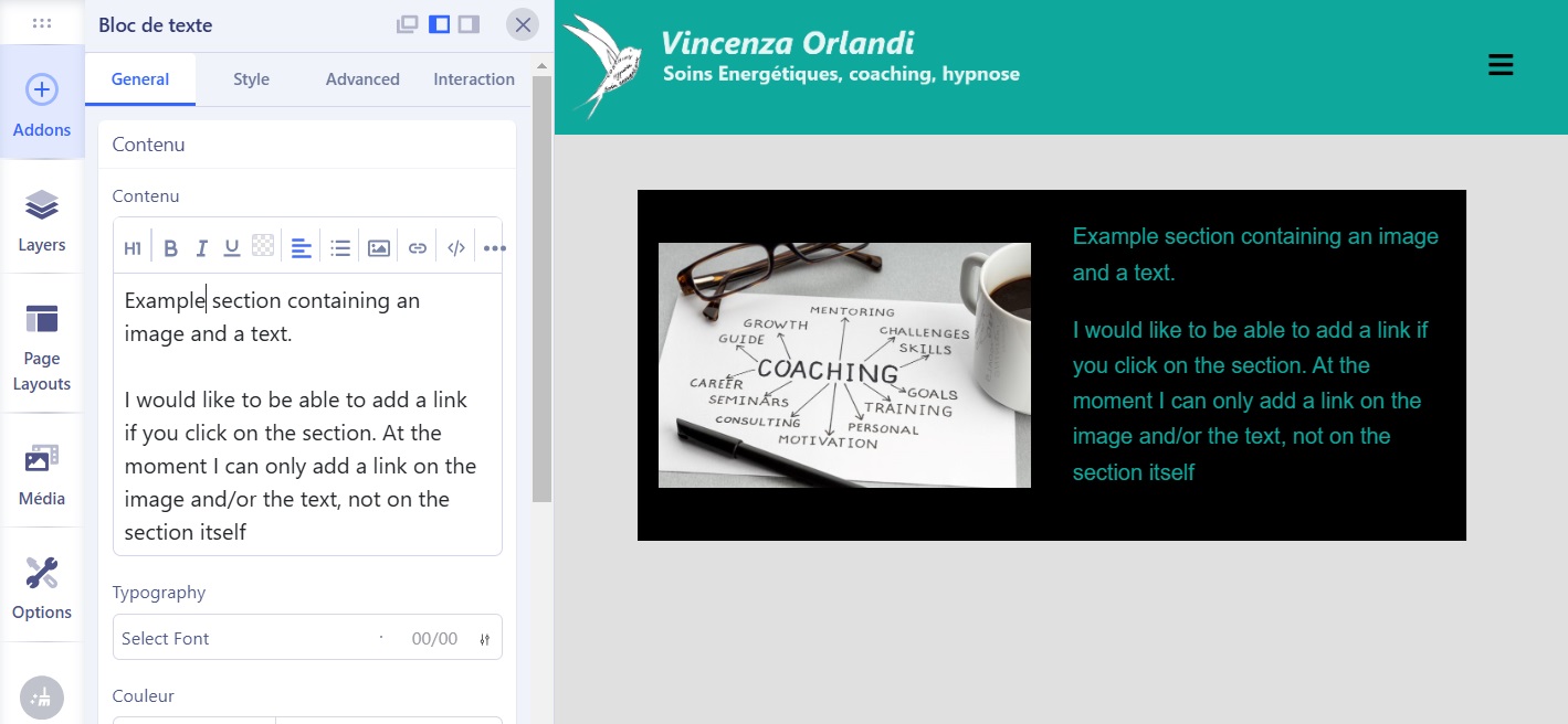 I added a raw html before my section with <a href ="#"> and then another raw html after the section with </a> and it works fine...