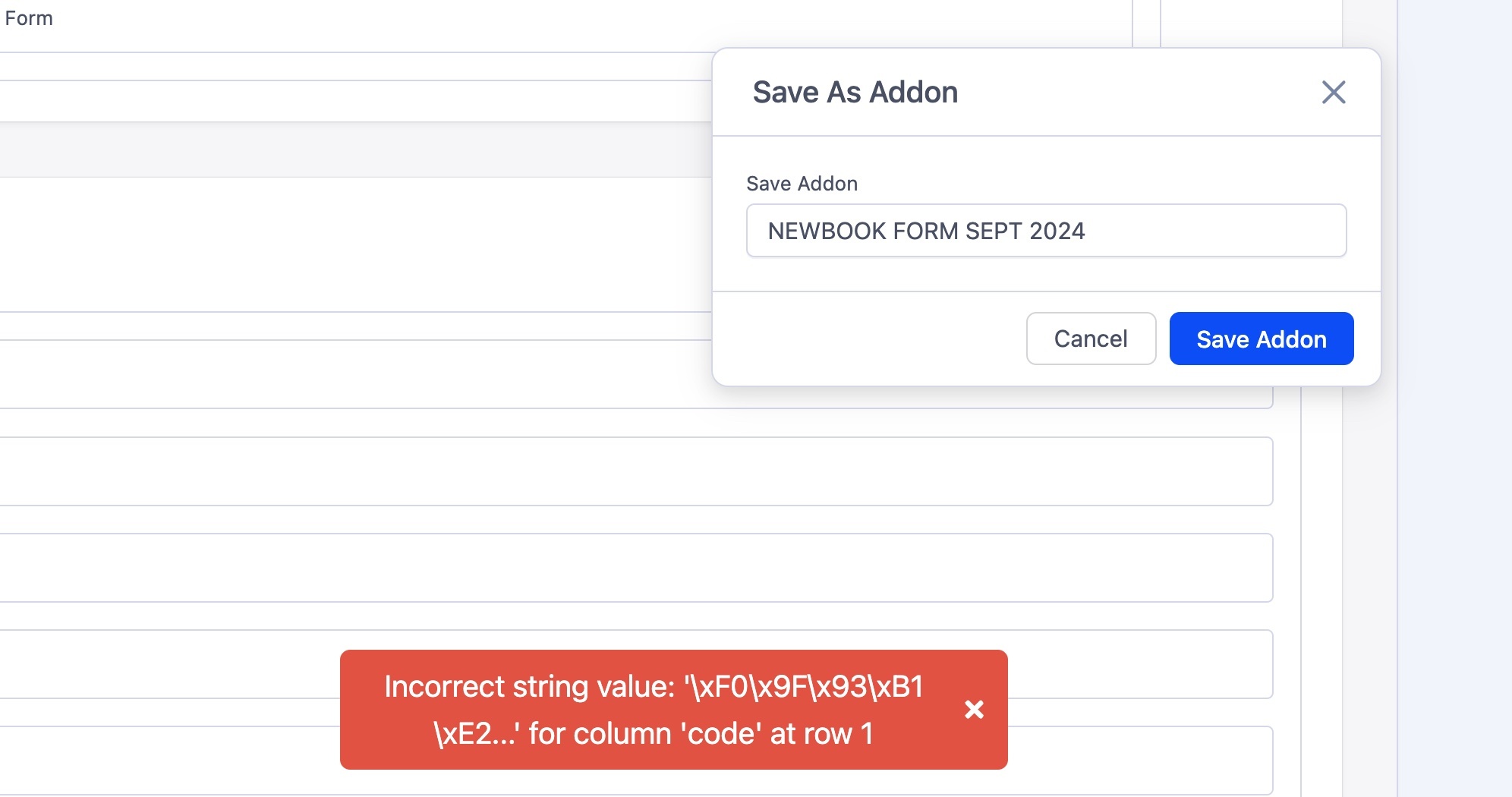 I am getting an error when trying to save Add-Ons and Sections. It reads as follows in a red box that pops up for a few seconds before disappearing: