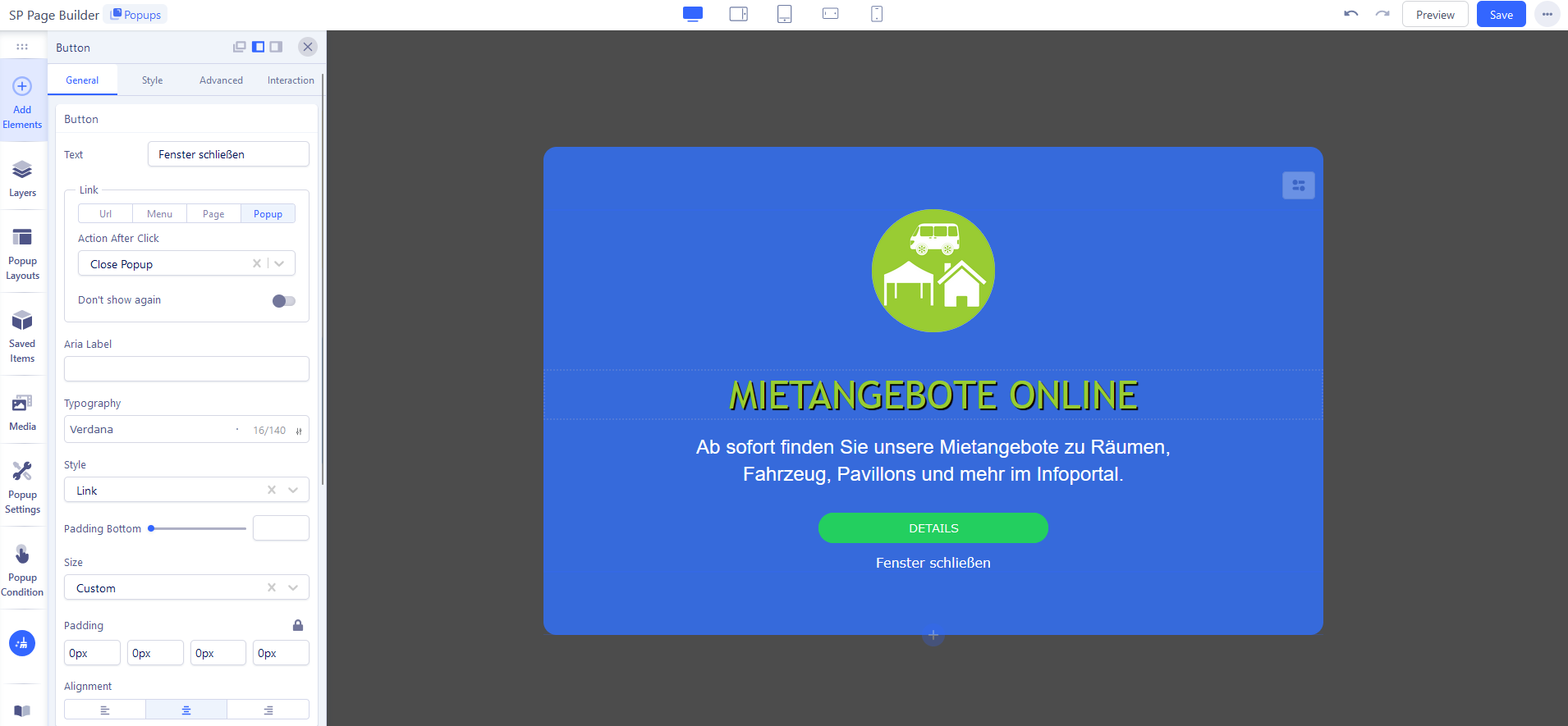 But if you create a "Button" element and, as shown in the screenshot, call up the button's settings and set the link function "Action after Click" to "Close Popup", nothing happens when you click on this button.