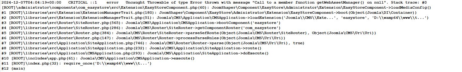 After installing the build you sent me, there is a new error when I click on any product in the product list. Instead of displaying the details about the product, I get the "Call to a member function getWebAssetManager() on null" error. Please see the image at the following url, for more info about the error: https://www.elegance.nz/images/call_to_a_member_function_on_null.jpg Looking in the administrator/logs/everything.php file, I can see that the error is initiated from the getWebAssetManager() function in Extension\EasyStoreComponent->loadMediaConfig(). Please see the image at the following url, for more details about this error: https://www.elegance.nz/images/Call_to_a_member_function_getWebAssetManager_on_null.jpg I hope this helps with solving the problem. Thank you.