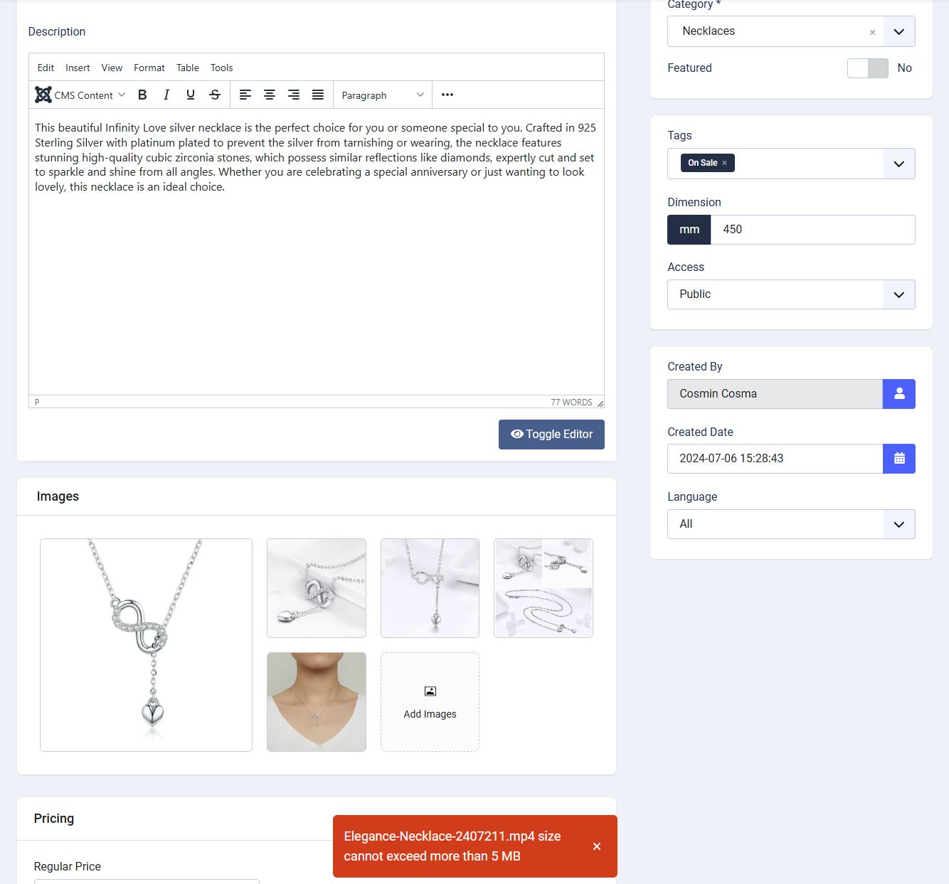 I'm trying to upload a mp4 video to my product and I get an error stating that the file size cannot exceed more than 5 MB. Please see the error image https://www.elegance.nz/images/Elegance-Media-Size-Restriction.jpg The maximum size set for Joomla media files in System-Global Configuration-Media is set to 64MB and my Upload Max Filesize php setting is 64MB as well. Could you tell me please where can I change this limit? Thank you.