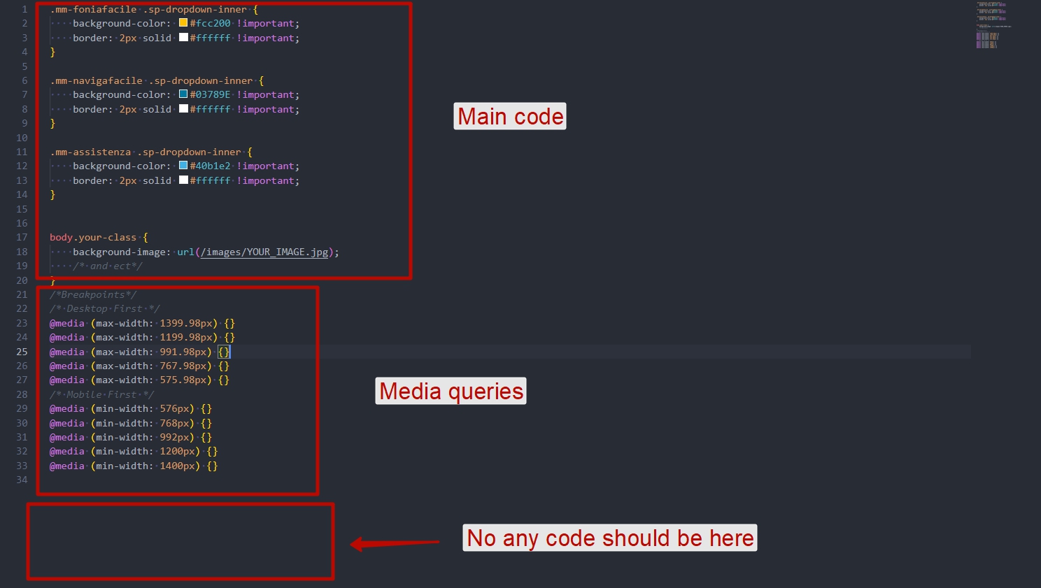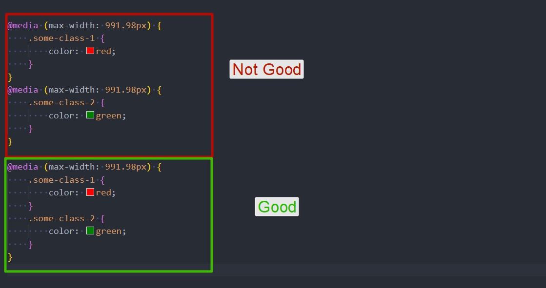 Organize your code. For example, all media queries should be at the very bottom and should have a specific order and standard values. These values are universal.
