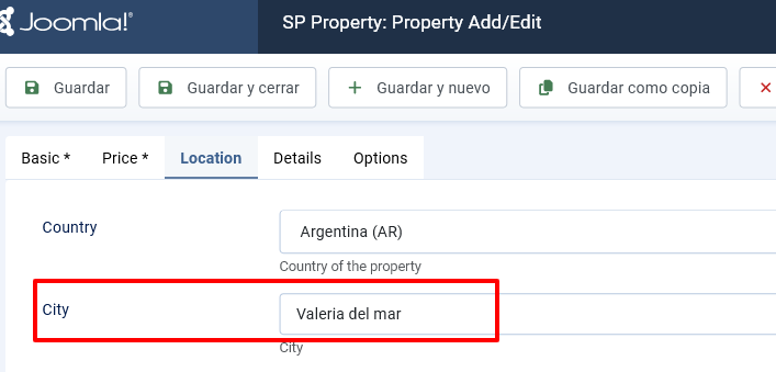 I enter Valeria del Mar in the "CITY" field of the property, for example, in another property: Ostende, and in another: Pinamar. The search engine drop-down list shows "CITY"