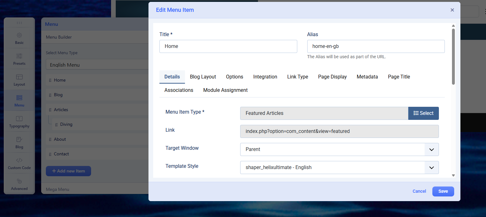 "Home" in English Menu for "Shaper_helixultimate - English"