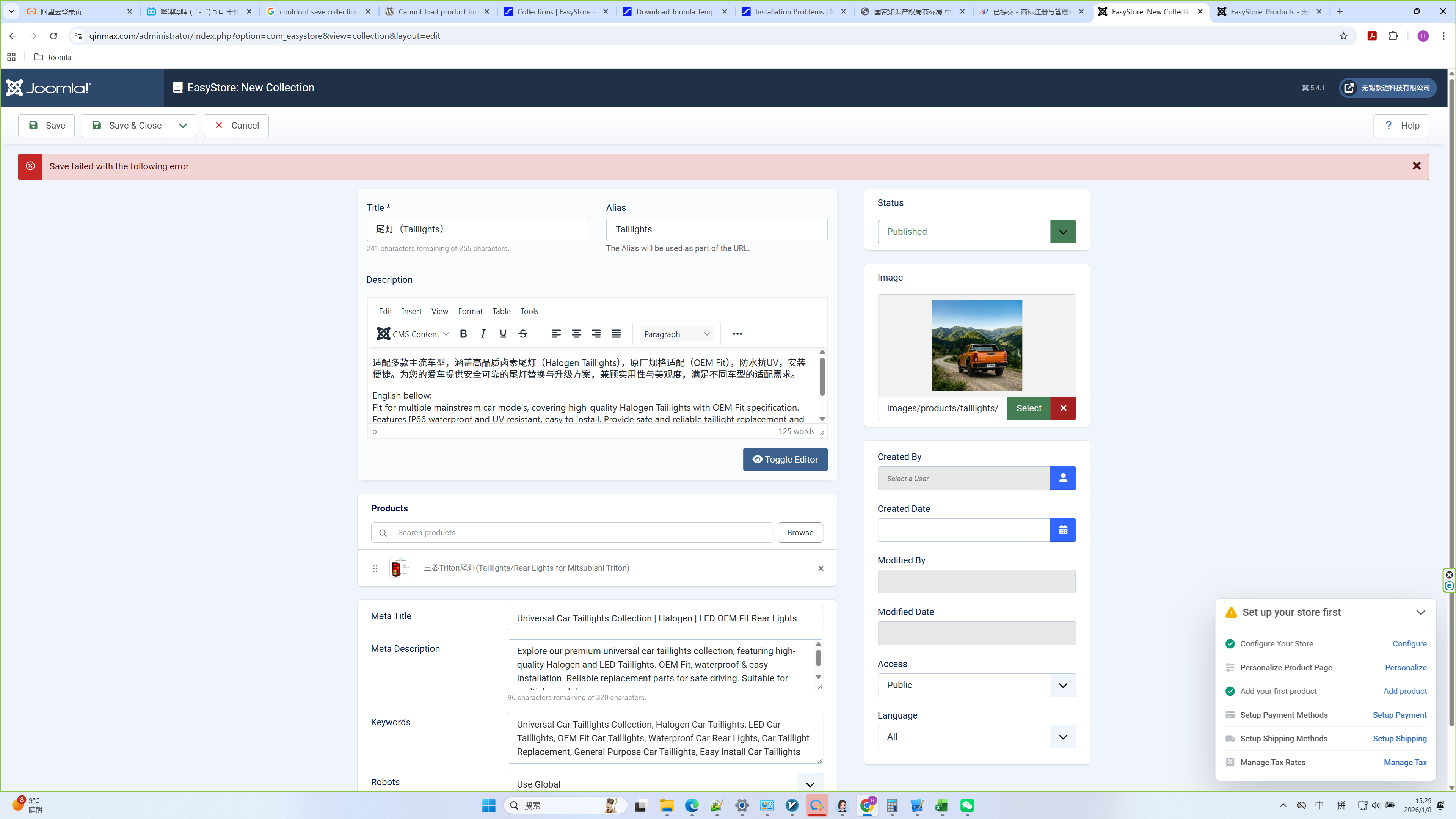 After create a new product, and then try to create a new collection to group up the product, the action is failed. but, the error mesage is empty. I could not know the reason.