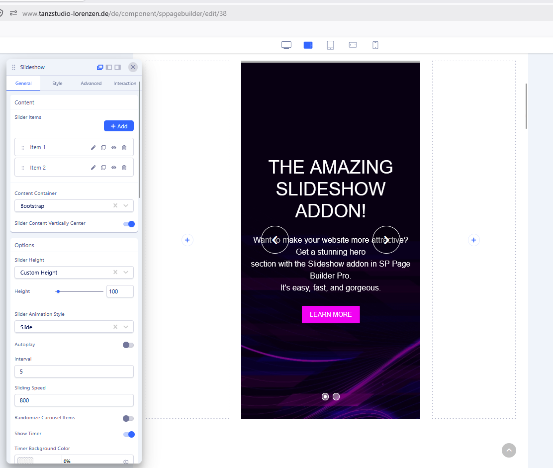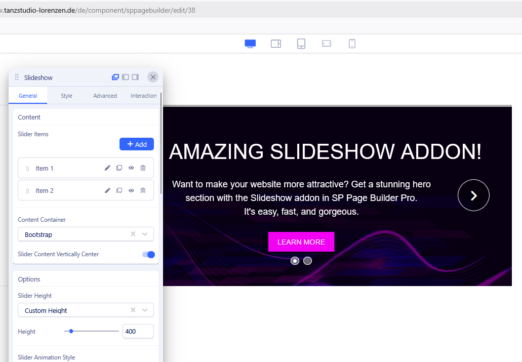 Hi there, I am using Joomla 5.3.x with SPPB latest Update. There is a the Addon "Slideshow" on some pages. I am facing a problem with some of these 5 views: Laptop, Tablet Landscape, Tablet Portrait, Mobile Landscape and Mobile Portrait With Laptop and Mobile Portrait everything works fine.