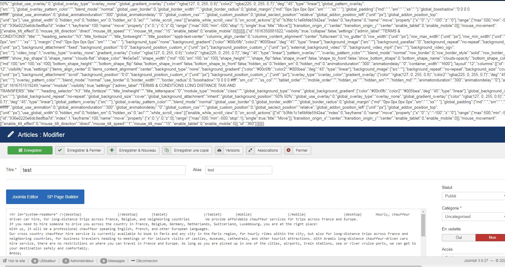 I just export from the .json of the page from SP page builder editor and then import it to the article, and then when I hit save I see this strange output.