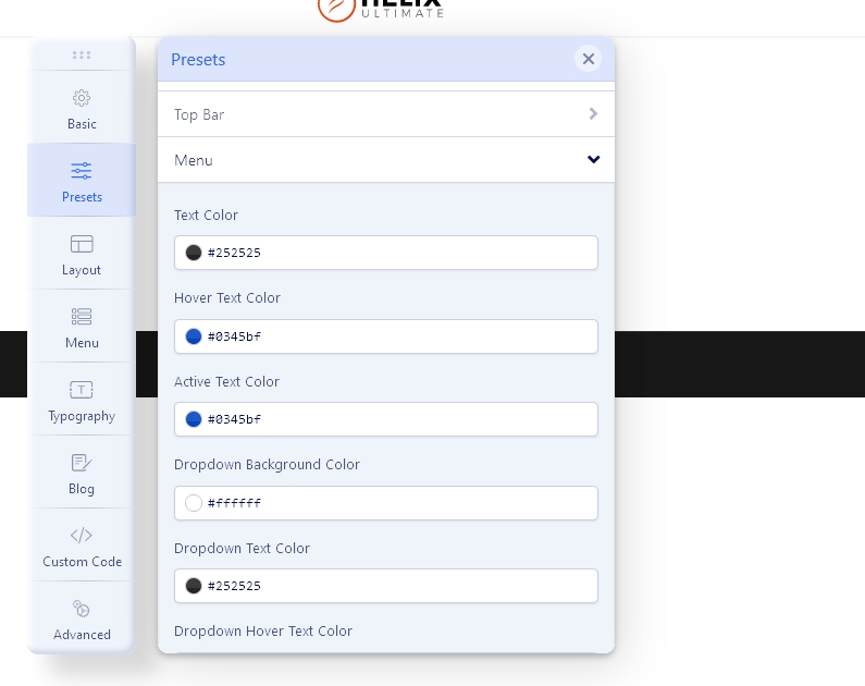 Hi any tip hove to get color settings on Helix U to work. I have a black header and i set the meny text to white and on hover light grey but all menus get a black text.