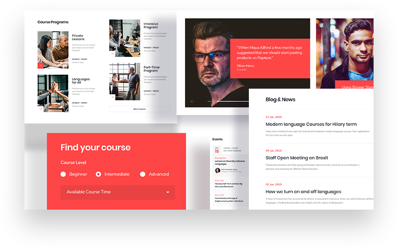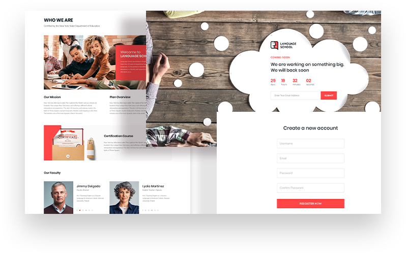 Kickstart a language learning site with all required pages given inside this Joomla language school template pack. There are ready pages like Registration, Coming Soon, About, Login, 404 and more.